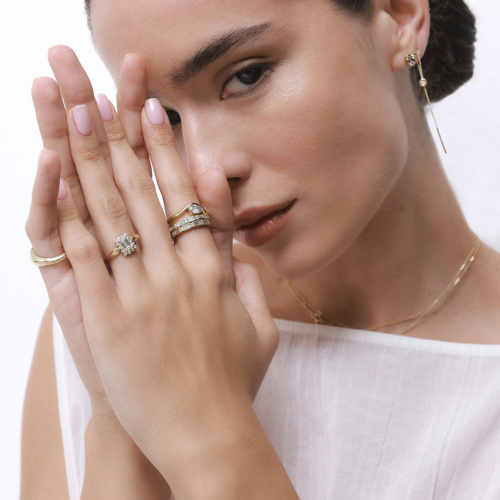 טבעת פרינסס עשויה זהב 14K משובצת יהלומי מעבדה בחיתוך אמרלד ויהלומי מעבדה עגולים