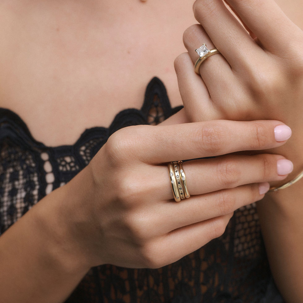 טבעת שלי נוצרה עבור לקוחה ששמה שלי. הלקוחה רצתה שנכין טבעת זהה לאורך כל היקף הטבעת, ושתהיה משובצת יהלומים שחורים שקועים בתוך הטבעת. בכל היקף הטבעת יש בין היהלומים ריקועים הנעשים בעבודת יד.
