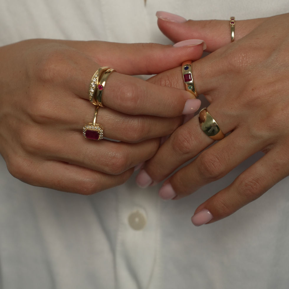 טבעת תמר עשויה זהב צהוב 14K משובצת אמרלד, רובי וספיר