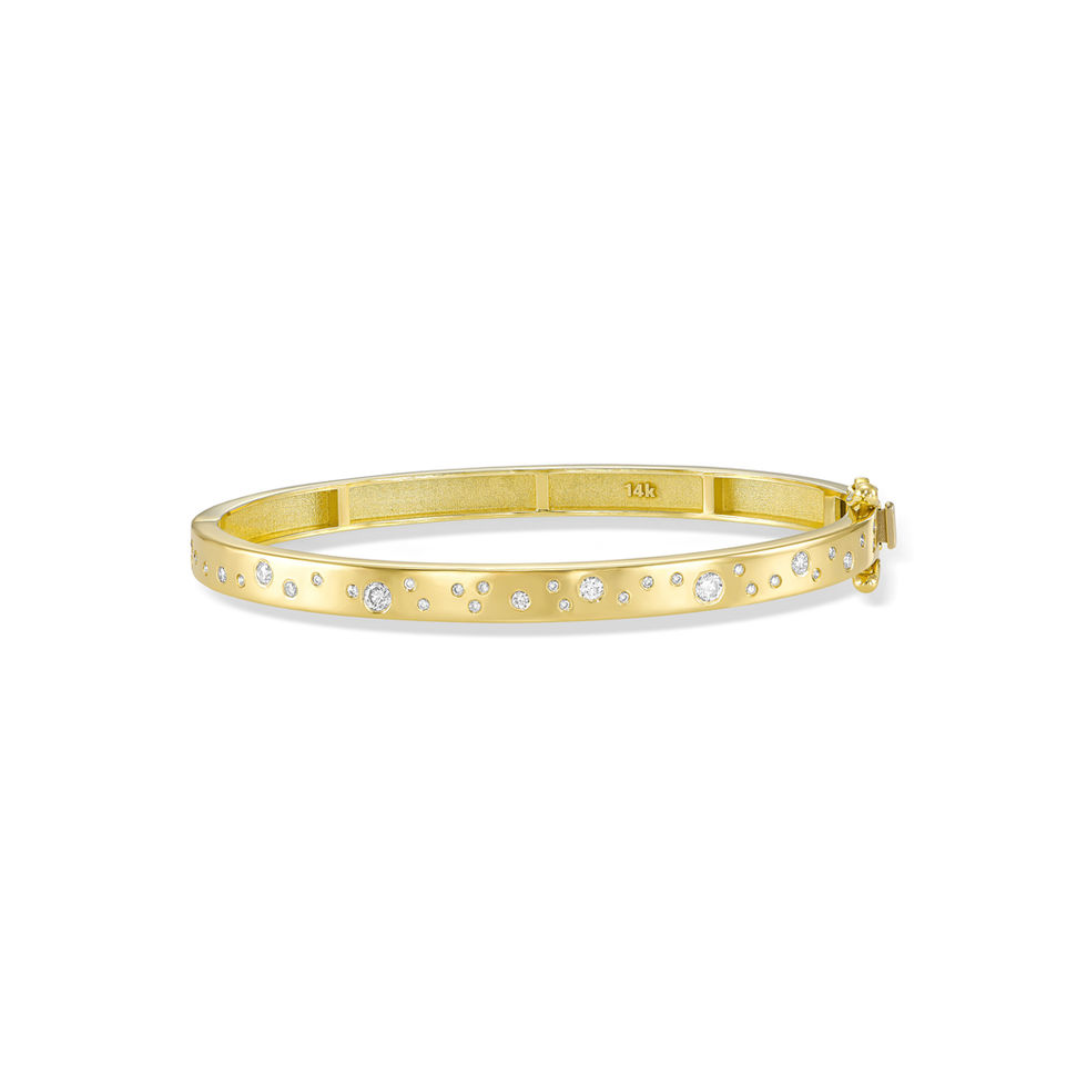 צמיד קלרה עשוי זהב 14K. שיבוץ היהלומים העדין, בגדלים שונים ובפיזור א-סימטרי, יוצר מראה אלגנטי כאילו כוכבים נצנצו על רקע זהב טהור.שילוב בין קלאסיקה ונוכחות בולטת.